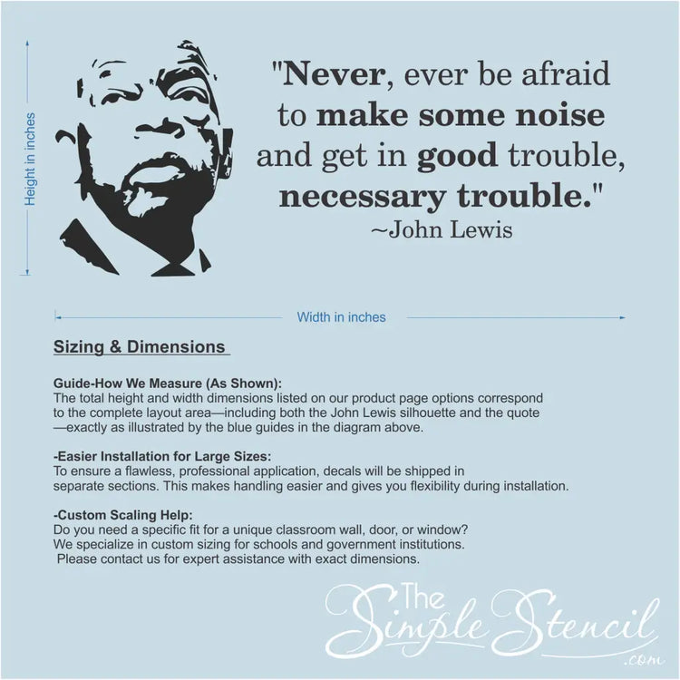 Bring a powerful piece of history into your environment with our John Lewis Good Trouble wall decal set. This striking vinyl display features the iconic silhouette of the Civil Rights leader alongside his timeless call to action: "Never, ever be afraid to make some noise and get in good trouble, necessary trouble."