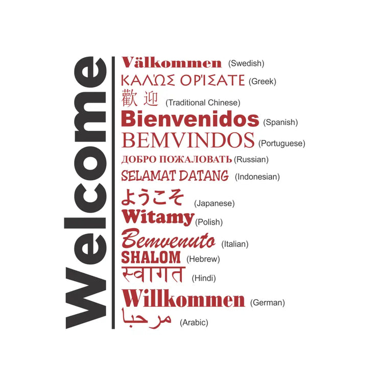 Welcome in 15 languages is a great way to welcome friends, customers and/or students from all nationalities to offer a sense of inclusion in an easy and stylish welcoming way.