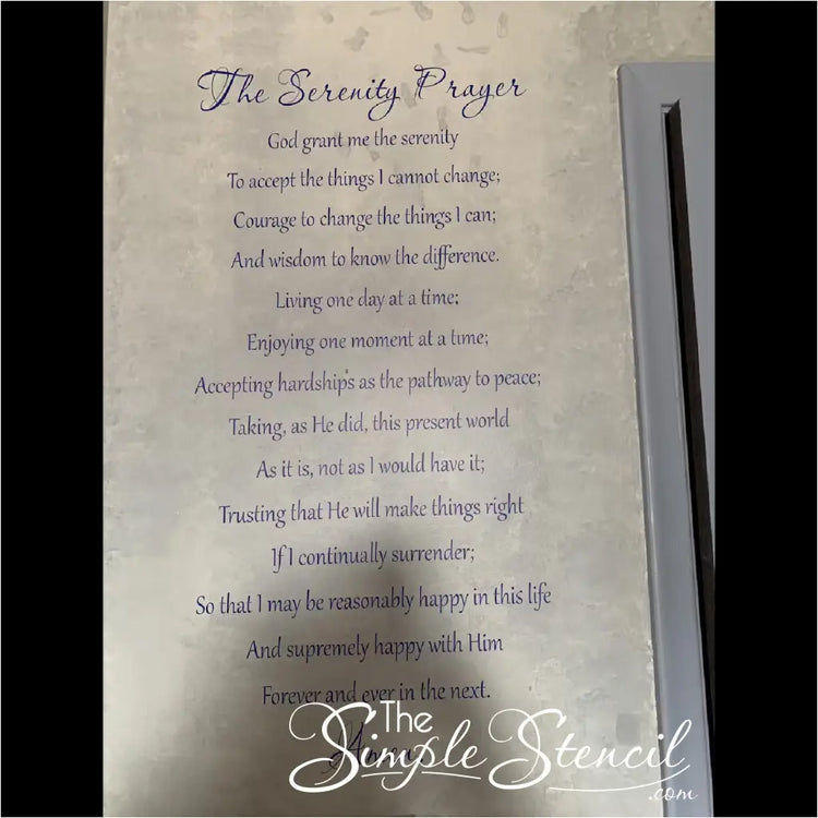 Reads: The Serenity Prayer God grant me the serenity To accept the things I cannot change; Courage to change the things I can; And wisdom to know the difference. Living one day at a time; Enjoying one moment at a time; Accepting hardships as the pathway to peace; Taking, as He did, this present world As it is, not as I would have it; Trusting that He will make things right If I continually surrender; So that I may be reasonably happy in this life And supremely happy with Him Forever and ever in the next. Amen.