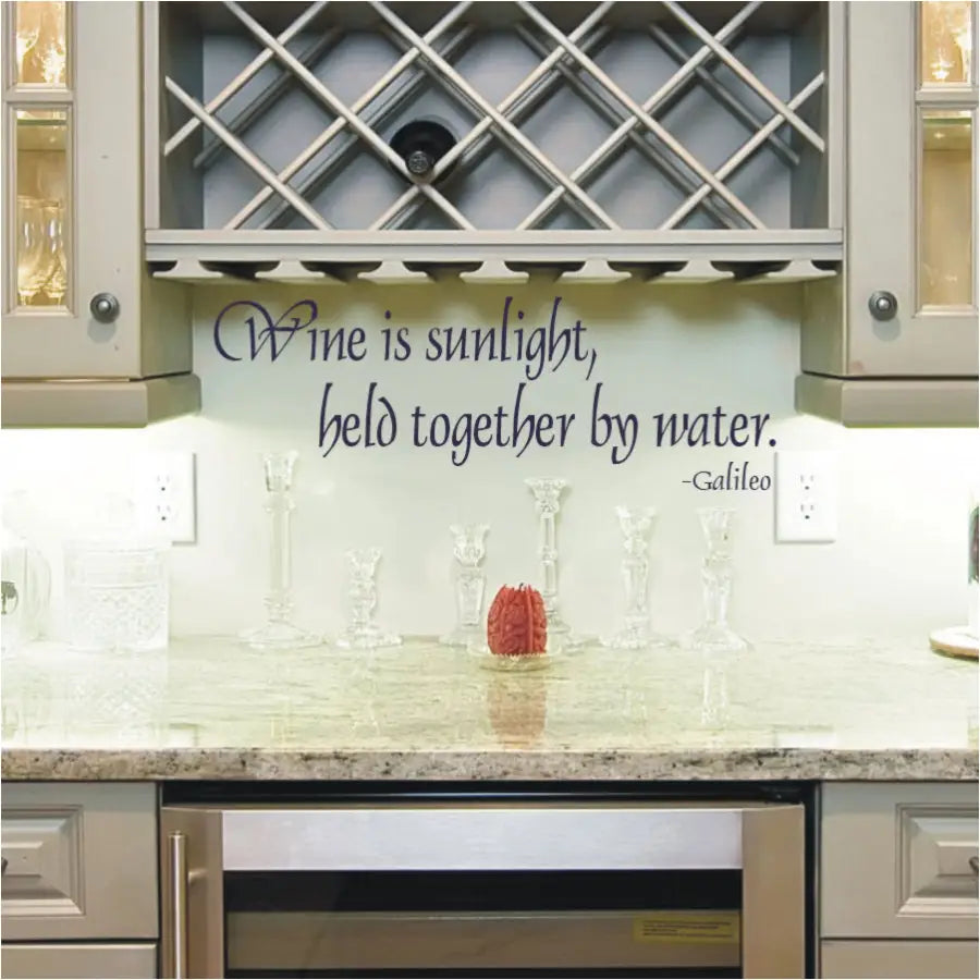 Wall quote decal by Galileo to decorate a wine cellar or near a wine rack. Reads: Wine is sunlight held together by water.