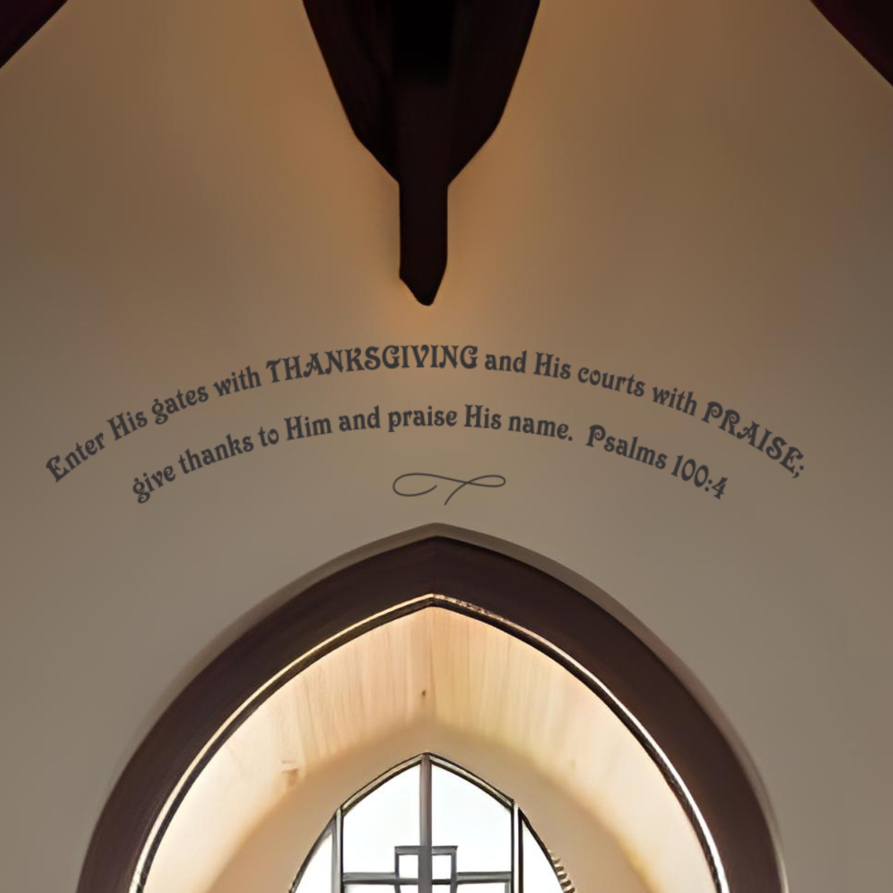 This decal is an ideal piece of church wall decor, serving as a permanent, powerful scripture quote over doors or windows, especially during the Thanksgiving holiday season. The arched version fits beautifully above double doors, chapel entrances, large windows, or behind the church podium, setting a tone of gratitude and worship the moment congregants arrive.