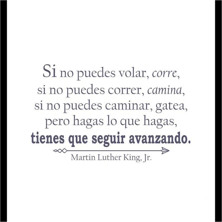 Reads: Si no puedes volar, corre, si no puedes correr, camina, si no puedes caminar, gatea, pero hagas lo que hagas, tienes que seguir avanzando. - Martin Luther King, Jr. and the English translation reads: If you can't fly, then run, if you can't run, then walk, if you can't walk, then crawl, but whatever you do you have to keep moving forward. The English version of this decal can be found here.